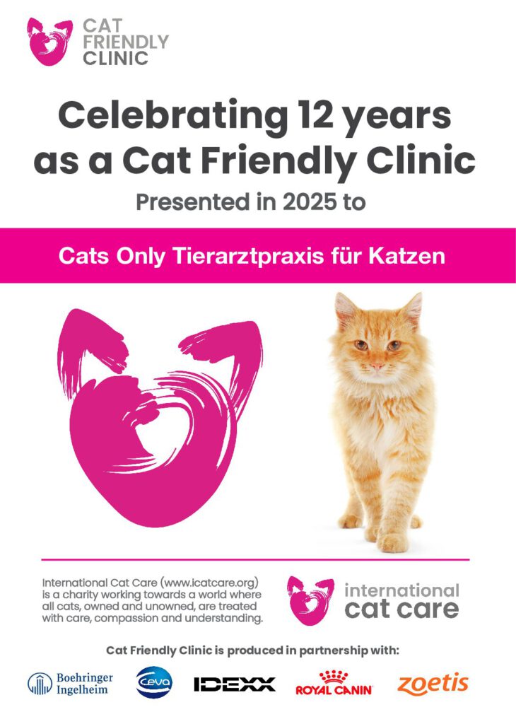 Cats Only – Tierarztpraxis für Katzen wurde im Jahre 2012 von der International Society of Feline Medicine (ISFM) als katzenfreundliche Tierarztpraxis mit Goldstatus zertifiziert.